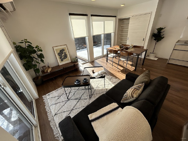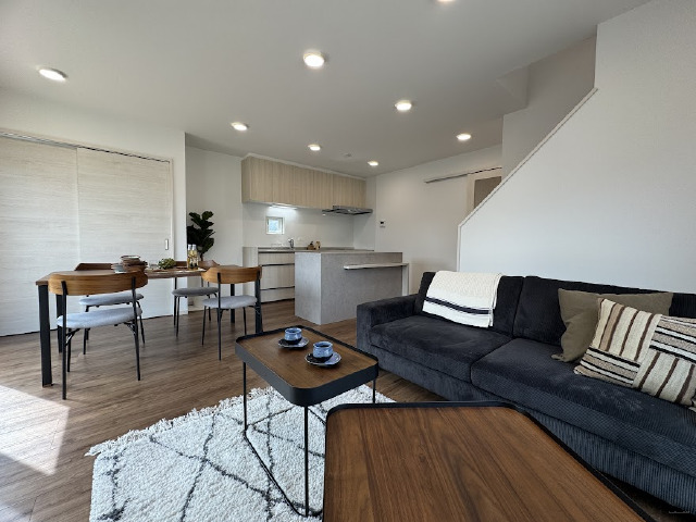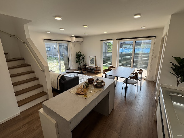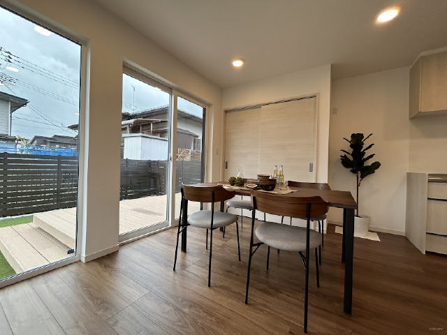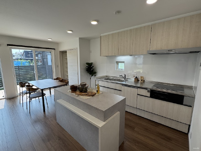 駐車場3台以上、公営水道、公共本下水、外構、オール電化、エアコン2台、インテリア・小物一式、食洗器、オリジナルアイランドカウンター、パントリー、プロジェクター付き照明、シューズクローゼット、ウォークインクローゼット、人工木材ウッドデッキ、人工芝、フェンス、TVモニタ付インターホン |