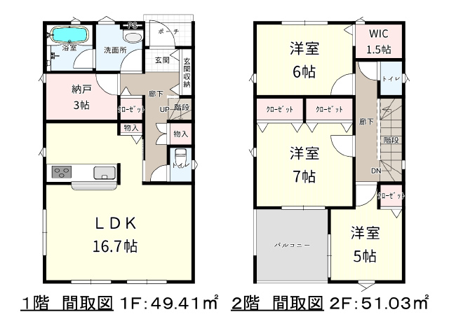 (1階)LDK16.7、納戸3、(2階)洋5、洋6、洋7、WIC1.5 |