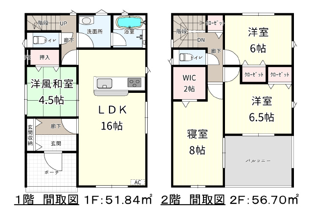 (1階)LDK16、和4.5、(2階)洋6、洋6.5、洋8、WIC2 |