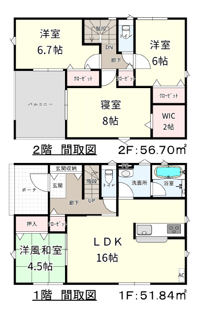 (1階)LDK16、和4.5、(2階)洋6、洋6.7、洋8、WIC2 |