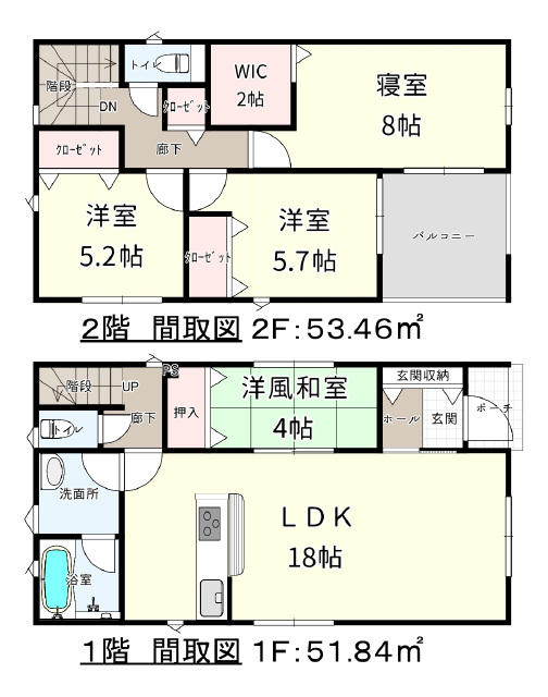 (1階)LDK18、和4、(2階)洋5.2、洋5.7、洋8、WIC2 |