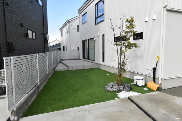 駐車場3台以上、公営水道、公共本下水、オール電化、外構、床暖房、エアコン5台、家具、食洗器、シューズクローゼット、ウォークインクローゼット、タイルデッキ、人工芝、宅配ボックス |