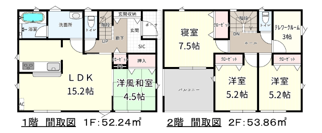 (1階)LDK15.2、和4.5、(2階)洋5.2、洋5.2、洋7.5、S3 |