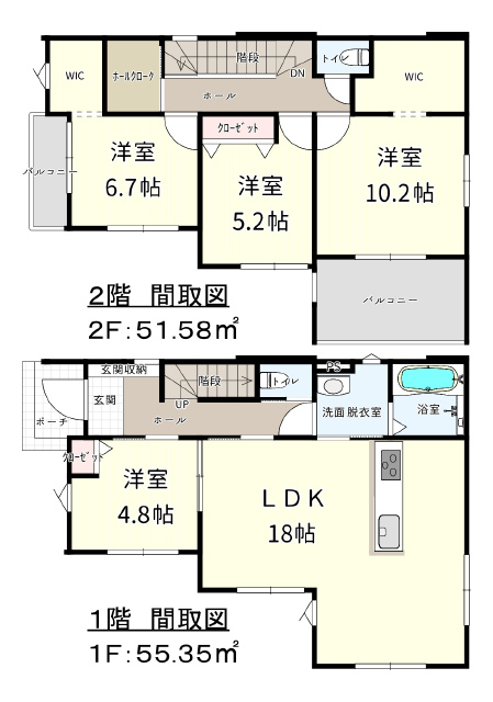 (1階)LDK18、洋4.8、(2階)洋5.2、洋6.7、洋10.2、ホールクローク |