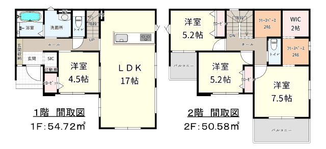 (1階)LDK17、洋4.5、(2階)洋5.2、洋5.2、洋11.5 |