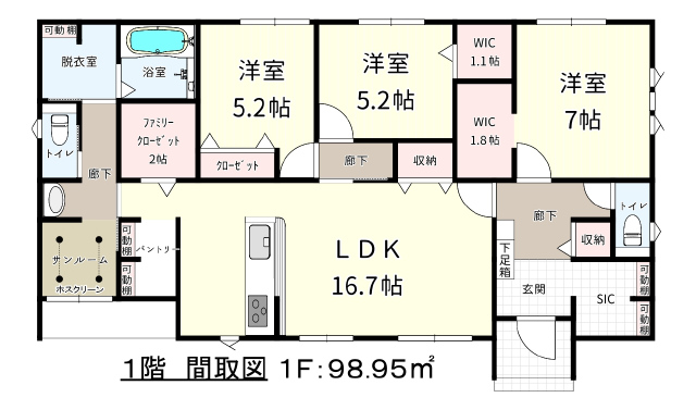 (1階)LDK16.7、洋5.2、洋5.2、洋7、FC、サンルーム |