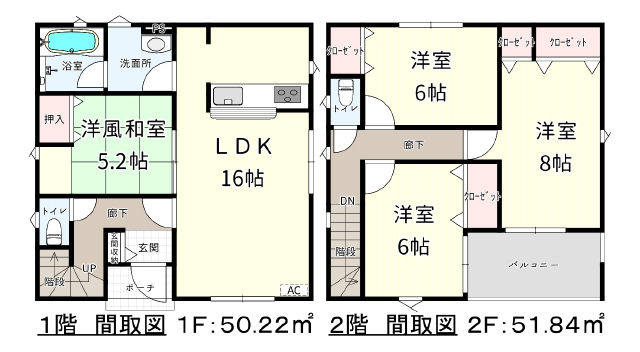 (1階)LDK16、和5.2、(2階)洋6、洋6、洋8 |